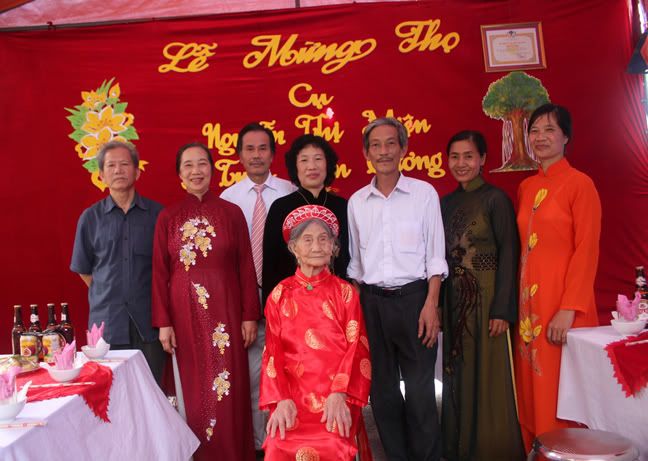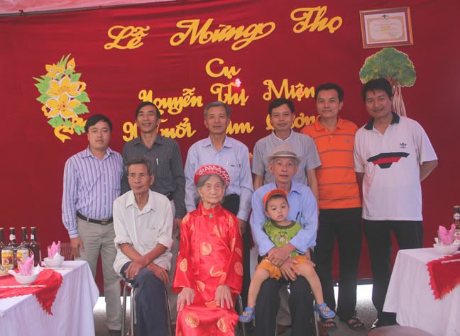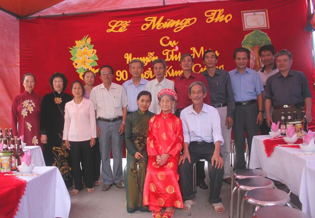 Bác dâu mình ra viện mấy ngày thì tới sinh nhật của Cụ, các anh, chị của mình dưới Hải Dương tổ chức Lễ mừng Đại thọ Cửu tuần cho cụ. Cả đại gia đình đều rất vui mừng đến mừng thọ Cụ. :emoticon-0155-flowe Vẻ đẹp tuổi Kim Cương – Cụ vẫn còn giữ được những nét đẹp thời trẻ. :emoticon-0157-sun: http://i294.photobucket.com/albums/m...IMG_4201-1.jpg Ngày xưa có câu đối: Cửu trật tằng lưu thiên tải thọ. Thập niên tái tiến bách linh thương. (Chín chục hãy còn ngàn tuổi thọ. Mười năm lại chúc chén trăm năm). Cầu mong Cụ mãi minh mẫn, mạnh khỏe để đại gia đình sẽ được mừng cụ Trường thọ Bách niên chi lão. :emoticon-0157-sun: Nhạc tấu vân ngao ca bách tuế. Đức huy đồng sử chúc thiên thu. (Nhạc tấu vân ngao, mừng trăm tuổi. Đức ghi đồng sử, chúc ngàn năm). Vài ảnh Lễ mừng Đại thọ Cửu tuần của Cụ. :emoticon-0157-sun: http://i294.photobucket.com/albums/m...e/IMG_4165.jpg http://i294.photobucket.com/albums/m...IMG_4172-1.jpg http://i294.photobucket.com/albums/m...IMG_4190-1.jpg |