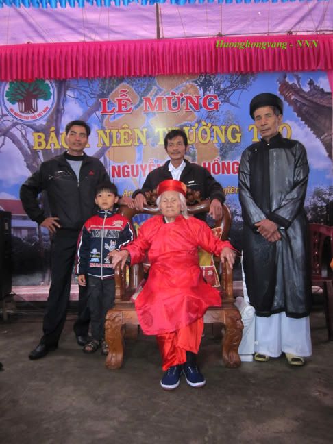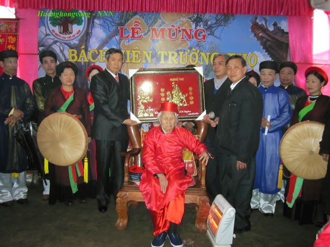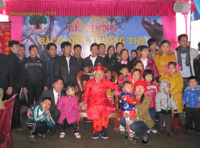 Thượng thọ vưu đa Bách tuế nhân. (Đã nhàm câu nói: xưa nay hiếm. Trăm tuổi ngày nay đã nhiều người). Xuân Nhâm Thìn năm nay đại gia đình của mình vô cùng mừng vui vì bố/chú/bác ruột tròn 100 tuổi. (*) Bác thứ 8 là anh ruột của bố mình nhưng mình hay gọi bác là “thày” theo kiểu gọi bố mẹ là “thày bu” ở quê mình. :emoticon-0100-smile Mùng 6 tháng giêng năm Nhâm Thìn đại gia đình mình và dòng tộc cùng bà con trong làng đã tổ chức Lễ mừng Cụ Trường thọ Bách niên chi lão. :emoticon-0157-sun: Cán bộ UBND xã, Đảng ủy xã, UBND huyện đã đến chúc mừng, tặng quà và chuyển quà của Chủ tịch nước gửi tặng Cụ 5m lụa và 500.000đ. :emoticon-0155-flowe Thời chiến tranh chống Mỹ các anh mình (con trai cụ) đều lên đường đánh Mỹ và có một anh hy sinh ở miền Đông Nam bộ. :emoticon-0106-cryin Cụ là người yêu nước, sống trung thực, lạc quan, chăm lao động, giản dị, chan hòa, yêu thương con, cháu. :emoticon-0155-flowe Giờ đây tuy đã 100 tuổi nhưng Cụ vẫn mạnh khỏe, vẫn đi lại được và còn rất minh mẫn, vẫn luôn bảo ban các cháu, chắt, chút những điều hay lễ phải. Cháu đích tôn của Cụ đã có cháu đích tôn (tức là chút gọi Cụ là Kị). :emoticon-0157-sun: Trong lễ mừng Trường thọ Cụ khi mọi người lên chúc mừng, Cụ đáp lời bằng những câu thơ rất hóm hỉnh rồi đưa phong bao đỏ mừng tuổi cho mọi người lấy may đầu năm. :emoticon-0157-sun: Con dâu Cụ quê ở Bắc Giang cùng các em họ của chị ấy về hát mừng quan họ Bắc Ninh rất hay. :emoticon-0159-music Tất cả các cháu – mọi người ở xa đều về quê mừng thọ Cụ. Buổi lễ mừng Trường thọ bách niên của Cụ nói chung rất vui và cảm động... Mình đưa vài ảnh do cháu ngoại mình chụp, vì nhiều máy ảnh chụp quá nên mọi người nhìn ra mấy hướng. Huyên thảo hàm phương thiên tuế diệm Cúc hoa hương động ngũ chu tân. (Cỏ huyên thơm ngát ngàn năm tươi Hoa cúc hương bay năm gốc mới). Ngũ đại đồng đường - con trai cả, cháu đích tôn, chắt và chút nội của Cụ. http://i294.photobucket.com/albums/m.../IMG_5839a.jpg Nãi vũ nãi văn nãi thọ. Như mai như trúc như tùng. (Là vũ, là văn, là thọ. Như mai, như trúc, như tùng). Các anh chị là con trai, con gái của Cụ. http://i294.photobucket.com/albums/m.../IMG_5840a.jpg Huyên thảo điệt linh thiêm tú sắc. Lê viên khách thọ bá huy âm. (Cỏ huyên năm tháng thêm tươi đẹp. Vườn lê chúc thọ rộn âm thanh). Các cháu nội, chắt, chút của Cụ. http://i294.photobucket.com/albums/m.../IMG_5846a.jpg Nhạc tấu vân ngao ca bách tuế. Đức huy đồng sử chúc thiên thu. (Nhạc tấu vân ngao, mừng trăm tuổi. Đức ghi đồng sử, chúc ngàn năm). Đại diện UBND xã và Đảng ủy xã lên chúc thọ và tặng quà Cụ. http://i294.photobucket.com/albums/m.../IMG_5852a.jpg Kính chúc Thày thọ tỷ Nam Sơn, vạn thọ vô cương, thọ đồng kim thạch @};- thày mãi là chỗ dựa tinh thần, là tấm gương sáng cho chúng con soi vào. :emoticon-0155-flowe |