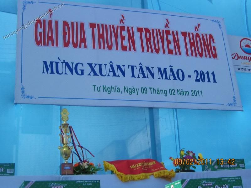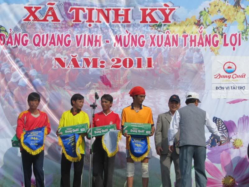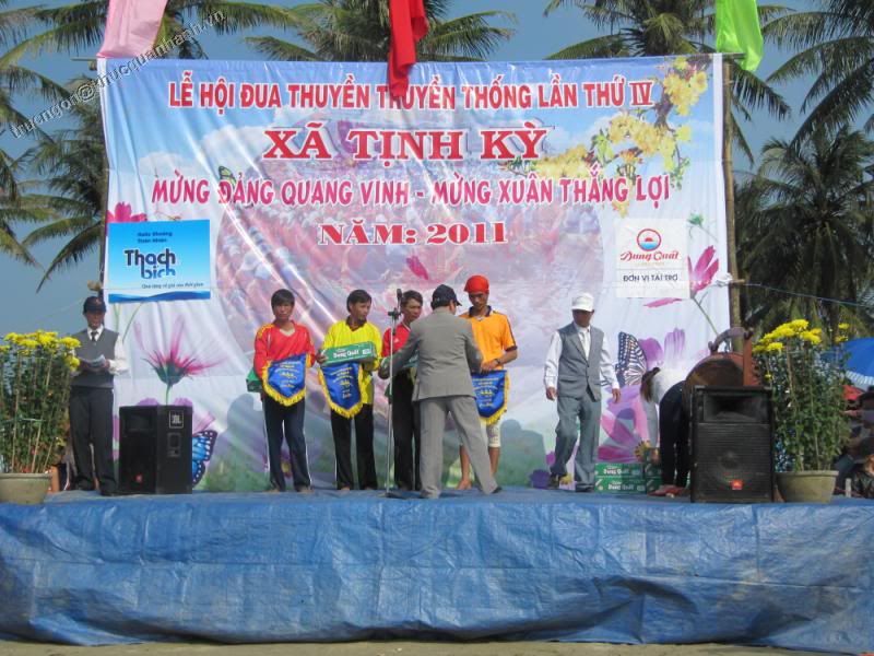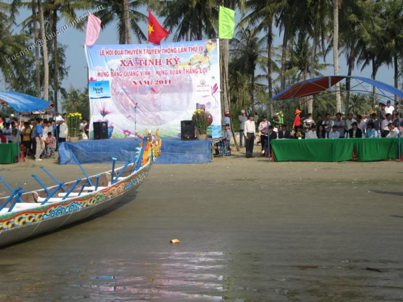 Đua thuyền là một trong những lễ hội truyền thống của cư dân vùng sông nước. Quảng Ngãi quê em không nằm ngoài những lễ hội đó. Năm nay do con nước tháng Giêng nên lễ hội đua thuyền tổ chức tại các khu vực trong tỉnh hầu như gần nhau nên không có dịp tham gia hết. Chính vì vậy nghiahoa xin đăng tải một số hình ảnh của lễ hội đua thuyền tại hai khu vực giáp biển đó là xã Tịnh Kì Tịnh Long và xã Nghĩa An. 1. Tịnh Kì; Tịnh Long: Là hai xã nằm phía đông của huyện Sơn Tịnh, nằm sát khu du lịch biển Mỹ Khê và quần thể di tích khu chứng tích Sơn Mỹ. Lê hội đua thuyền năm nay diễn ra nhằm ngày mùng Bốn Tết, Mùng năm và Sáu Tết. http://i1106.photobucket.com/albums/...1/IMG_4948.jpg http://i1106.photobucket.com/albums/...1/IMG_4949.jpg Trên các con đường nhỏ trong xã cờ, khẩu hiệu, bandrole cổ động tại không khí vui tươi, phấn khởi cho du khách và các vận động viên tham dự giải |