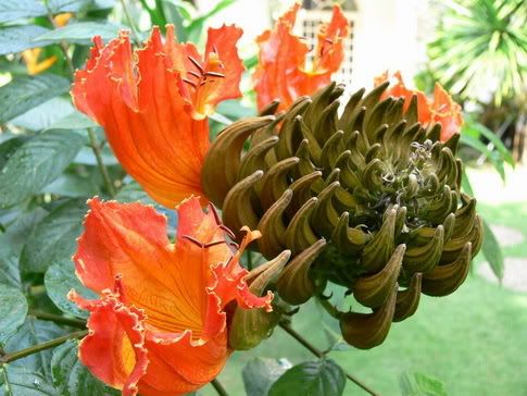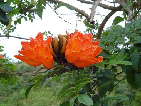 Cây này có tên gọi là Sò đo cam (Phượng hoàng đỏ), tên tiếng Anh là African Tulip Tree, Flame of the Forest; còn tên khoa học là Spathodea campanulata. Nó thuộc họ Đinh (Bignoniaceae). http://i216.photobucket.com/albums/c...h/sodocam4.jpg Cây này có nguồn gốc từ châu Phi nhiệt đới (Kenya, Uganda). Cây gỗ nhỡ, cao từ 12-20m, thân có vỏ hơi sần màu nâunhạt, phân cành nhánh ở đỉnh. Tán là mọc hình cầu, cây luôn luôn xanh. Lá mọc đối, lá kép lông chim một lần (lẻ). Có 6 đôi lá phụ, lá phụ hình bầu dục, phiến lá tròn ở đáy và có phần trót nhọn 0,5-0,8cm. Cuống lá có lông mịn. Cụm hoa là tán xim ở chót nhánh rất đẹp. http://i216.photobucket.com/albums/c...TulipTree1.jpg Hoa lớn có cánh dài 6-8cm, rộng 4-5cm có màu vàng cam rất tươi. Đài màu nâu và có lông mịn như nhung. Quả nang đứng và dài 3-4cm, hạt nhiều, có cánh. http://i216.photobucket.com/albums/c...ulipTree-a.jpg Mùa ra hoa quả từ tháng 11 đến tháng 4. http://i216.photobucket.com/albums/c.../sodocam2a.jpg Ở Sài Gòn, cây này được trồng nhiều ở công viên Lê Văn Tám và đường Hoàng Văn Thụ chị For ạ. Nếu thích chụp ảnh hoa này nữa, chị tới mấy chỗ đó chắc sẽ lượm được những bức ảnh ưng ý :emoticon-0150-hands |