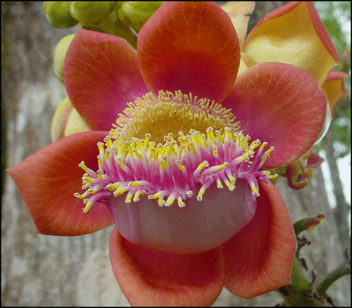 Sala có thể mọc cao lên đến 15m, tên khoa học là Couropita Guianensis, thuộc họ dầu (Dipterocarpaceae). Hoa chỉ mọc từ thân chính, có màu cam lẫn đỏ thắm và hồng, và mọc thành chùm trên cọng dài có khi tới 3m. http://i399.photobucket.com/albums/p...avn/1276_2.jpg http://i399.photobucket.com/albums/p...avn/1276_1.jpg Như cây Bồ Đề trong Phật Giáo Đại Thừa, Sala thường trồng trong các sân chùa Nam Tông ở Sri Lanka, Myanmar, Thái Lan, Campuchia, Lào và một số chùa Khmer Nam Bộ. Tín đồ Hindu Giáo Ấn Độ cũng xem cây sala thiêng liêng và thường trồng nơi đền thờ thần Shiva. Do kết cấu cả chùm hoa trông giống rắn thần (naga), mỗi bông là đầu và miệng phùng mang che phần nhụy trung tâm có hình một lingam của thần Shiva và nhiều shivalingam nhỏ bao quanh, nên được gọi là Nagalingam hay “hoa Shivalingam”. Hình tượng này làm ta liên hệ đến con rắn hổ mang chín đầu bảo vệ Đức Phật trong lúc ngài ngồi nhập định 49 ngày dưới cội cây bồ đề. http://i399.photobucket.com/albums/p...ouroupitaH.gif Hoa sala có mùi rất thơm, hương tỏa xa thanh thoát, được xem là loài hoa vô ưu hay ưu đàm. Sala nở rộ tượng trưng cho Phật Pháp (Dharma), và Đức Phật cuối cùng đã chọn giữa bóng hai cây này (song thọ) để nằm nghỉ và đi vào Niết Bàn. Trong phù điêu nghệ thuật Phật Giáo thường mô tả thân mẫu Đức Phật là Hoàng Hậu Maya sinh nở trong vườn Lumbini, khi bà đưa cánh tay phải lên vịn cành hái một đóa hoa sala và đã hạ sinh Thái Tử Siddhartha. Hoa sala mọc từng chùm trực tiếp từ thân cây chứ không mọc từ cành hay ngọn như những loài hoa khác, khiến ta có thể lý giải về biểu tượng Đức Phật được sinh ra từ cạnh sườn của Hoàng Hậu Maya. Hình tượng nữ Yashi (Dạ xoa) thân thể với vẻ đẹp lý tưởng đầy gợi cảm, nàng đang đứng dưới bóng cây sala với bàn tay phải với lấy cành cây, thường thấy mô tả trong nghệ thuật điêu khắc cổ. Thuật ngữ salabhanjika nguyên thủy gắn bó với lễ hội phồn thực “hái hoa sala”, điêu khắc thể hiện những hình tượng đồng nhất người nữ với cây, nhất là cây hoa sala. Ở Ấn Độ, ngày nay cây sala vẫn được thờ cúng, đặc biệt với những cặp hiếm muộn. http://i399.photobucket.com/albums/p...960422106A.jpg . Ở Sài Gòn, có thể thấy một số cây sala trồng trong Chùa Già Lam, Thảo Cầm Viên, Tao Đàn, Khu du lịch Bình Quới, hay trong chùa Xá Lợi Q3 như HoaMay đã thấy. (Sưu tầm) |