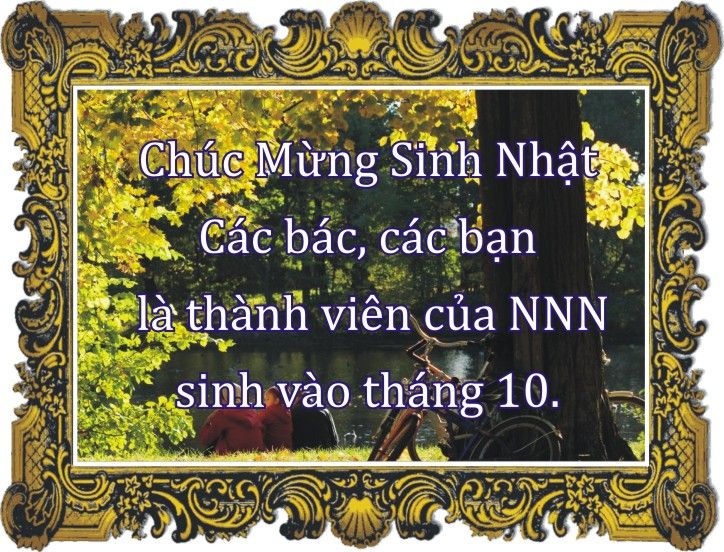 Xin chúc mừng tất cả các bác, các bạn là thành viên của NNN được sinh vào tháng 10. Chúc tất cả sức khỏe dồi dào, làm ăn phát đạt và luôn vui với cuộc sống hiện tại. |