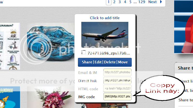 Bác không kể cụ thể trình tự của bác làm thế nào nên nhà em không biết nó tắc ở đâu. Bác cố gắng đọc kỹ bài viết theo link này nhé! http://diendan.nuocnga.net/showpost....5&postcount=11 Tóm lại là bác phải tạo được một tài khoản trên photobucket. Cách đăng ký như theo bài trong hướng dẫn của link trên. Khi đã có tài khoản thì bác có thể post ảnh lên bằng cách bấm vào Selest photos and videos rồi chọn ảnh cần post lúc này giống như ở FB. Sau khi up ảnh lên thành công bác muốn cho lên 4R ảnh nào thì lấy con chuột đưa đến cái hình đó. Cái hình đó sẽ nổi lên cùng với cái bảng đường Link như dưới đây: Bác hãy coppy cái đường link cuối cùng như chỉ dẫn rồi past vào bài viết của mình là xong. Chúc bác thành công! |