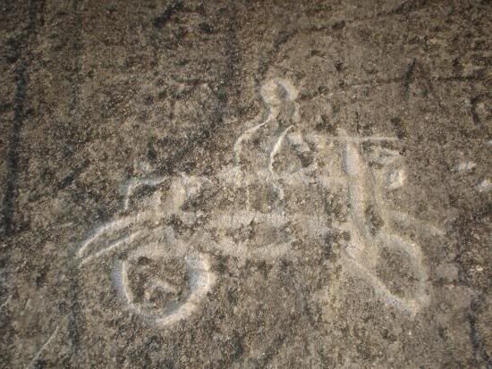 Bãi đá cổ mạn Hầu Thào tháng 4 năm ngoái em mới qua bác Geo ạ. So với những gì em nhìn thấy năm 1994, thì các tảng đá có vết khắc hiện nay có cái mới là đã bị nhốt trong mấy cái hàng rào bê tông bao quanh, giờ cái gãy cái còn. Có lẽ là người ta sợ trẻ trâu hay khách du lịch leo lên phá hoại, hoặc là "sáng tác" thêm các hình khắc như thế này chẳng hạn: