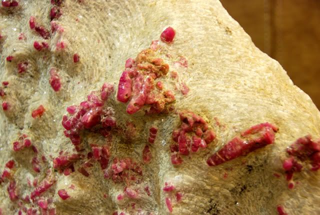 Nhưng như Geo đã nói, chất lượng ngọc của khối saphir ấy không cao, nên lấy ra mảnh nhỏ cũng không có giá trị gì mấy, vì làm nhẫn không đẹp. Nếu có mảnh to to một chút thì đánh bóng, làm đá trang trí thì "tạm được", vì dụ đây là một mảnh đập ra từ chính khối saphir đồ sộ đó: ![]() Tuy để ngoài trời, nhưng có người bảo vệ 24/24 đó, USY đừng mang búa đến đó nghe ![]() Tinh thể ruby trong đá hoa (cẩm thạch)