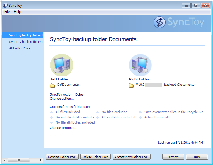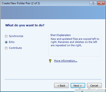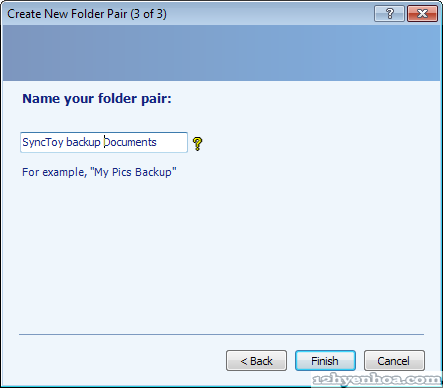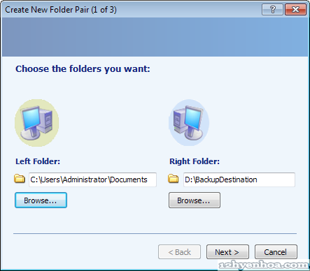 SyncToy là phần mềm miễn phí của Microsoft dùng để đồng bộ file và thư mục. Bạn có thể dùng SyncToy để: - Chia sẻ file giữa các máy tính có kết nối mạng - Tạo bản backup file và thư mục từ ổ đĩa này sang ổ đĩa khác, hoặc từ máy này sang một máy khác trong mạng Phiên bản mới nhất của SyncToy hiện giờ là 2.1. Download tại đây: http://www.microsoft.com/download/en....aspx?id=15155 BACKUP FILE / THƯ MỤC BẰNG SYNCTOY 1. Download SyncToy và cài đặt. Click Create New Folder Pair để chọn thư mục nguồn (cần backup) và thư mục đích (nơi chứa bản backup) ![]() 2. Bên trái chọn thư mục nguồn, bên phải chọn thư mục đích. Ở đây tôi backup toàn bộ thư mục C:\Users\Administrator\Documents sang thư mục D:\BackupDestination ![]() 3. Chọn kiểu backup. Có 3 kiểu là: - Synchronize: đồng bộ giữa 2 thư mục. Bạn tạo/xóa file ở thư mục nguồn thì file cũng được tạo/xóa ở thư mục đích và ngược lại (phù hợp với trường hợp muốn chia sẻ file giữa 2 máy tính) - Echo: File được copy từ nguồn sang đích, sau khi đồng bộ thư mục đích sẽ giống hệt thư mục nguồn (rất phù hợp với backup) - Contribute: File được copy từ nguồn sang đích, nếu đổi tên file ở nguồn thì file ở đích sẽ đổi tên theo nhưng xóa file ở nguồn thì file ở đích vẫn giữ nguyên. Túm lại giống Echo nhưng không có xóa file ![]() 4. Đặt tên cho cặp thư mục vừa chọn, ví dụ "SyncToy backup Documents" ![]() 5. Cuối cùng là chạy đồng bộ. Từ màn hình chính của SyncToy (hình 1) chọn cặp thư mục vừa tạo rồi click Run, SyncToy sẽ bắt đầu quá trình copy (nhớ là bạn phải luôn có quyền đọc/ghi lên thư mục đích)