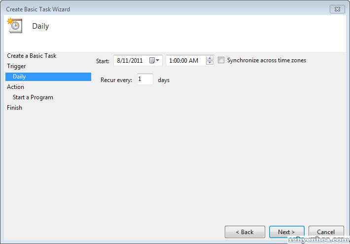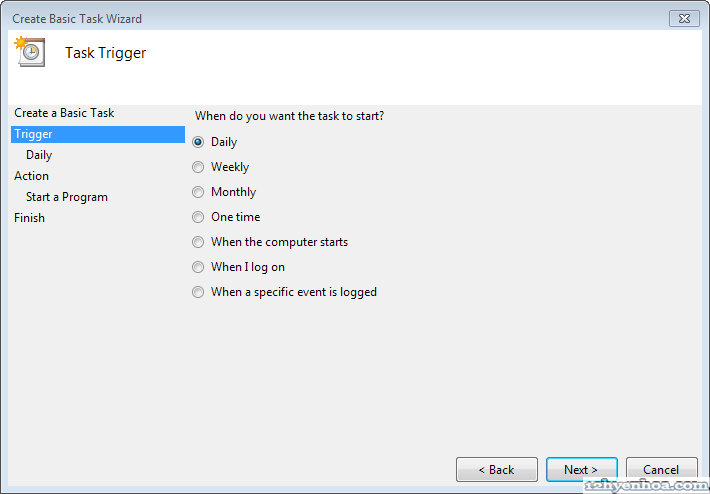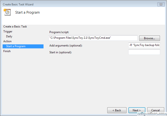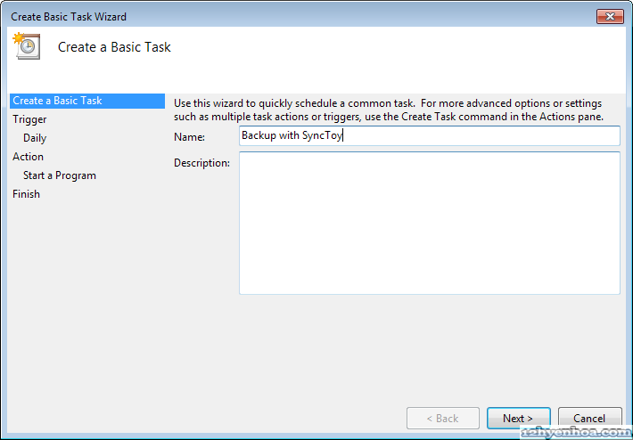 Nguồn: 12hyenhoa.com SyncToy có thể chạy ở chế độ command line. Vào thư mục cài đặt SyncToy (thường là C:\Program Files\SyncToy 2.1 nếu cài SyncToy version 2.1) bạn sẽ thấy file SyncToyCmd.exe Để chạy đồng bộ tất cả các cặp thư mục mở cửa sổ command line và gõ dòng lệnh: C:\Program Files\SyncToy 2.1\SyncToyCmd.exe -R Nếu chỉ muốn đồng bộ 1 cặp thư mục cụ thể nào đó thì thêm tên cặp thư mục vào cuối dòng lệnh, nhớ đặt tên cặp thư mục trong ngoặc kép "", ví dụ: C:\Program Files\SyncToy 2.1\SyncToyCmd.exe -R "SyncToy backup Documents" 1. Bây giờ mở Task Scheduler và tạo Basic Task ![]() 2. Đặt tên cho Task ![]() 3. Chọn chu kỳ backup, ví dụ muốn backup hàng ngày ![]() 4. Vào lúc 1 giờ sáng ![]() 5. Sẽ chạy một chương trình ![]() 6. Click Browse đến file SyncToyCmd.exe trên máy của bạn. Nhớ thêm tham số -R (và tên cặp thư mục nếu chỉ muốn đồng bộ cặp thư mục đó) như hướng dẫn ở trên. Click tiếp Next và Finish là hoàn tất ![]() Nếu muốn thử lại cho chắc bạn chọn tên task vừa tạo trong Task Scheduler, click chuột phải và chọn Run