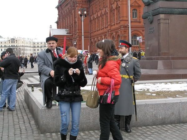 Mấy ông này, nhà trên Quảng trường Đỏ, Khi tôi đến, một ông còn ở đó... Hôm Cách mạng tháng Mười đi thăm lăng Lênin cùng Virus thì thấy một ông giống y xì đúc, cũng điệu bộ đi đi lại lại, tay trái đẩy vạt áo khoác và cho vào túi quần, giống lắm. Chụp ảnh chung với ông, phải mất 100 rub. Hôm mới rồi đi cùng chú Mít đặc ra tìm, thì không thấy ông ấy đâu, thay vào đó là một "ông Lênin" khác, béo ị. Chỉ có ông Nhicalai Đệ nhị vẫn ở đó. Thấy chú Kh. khoa CNTT MGU kể, hôm chú chụp ảnh với cả ông Lênin lẫn Sa hoàng Nhicalai Đệ nhị, khi trả tiền chú ta trả 500 rub, nhưng ông Lênin không có tiền giả lại, Sa hoàng trả lại cho cả hai ông là 300 rub, rồi hai "nhân vật lịch sử" vui vẻ dắt nhau đi ăn trưa. Còn chú B., cựu mem NNN ta (cũng không nhớ nick là gì) thì kể ở đó còn có Tổng thống Putin, cũng dáng đi giống hệt, một tay cố định bên cạnh sườn... Thôi post tạm ảnh ông Lênin béo vậy, mấy hôm nữa phuongnn sẽ ra cố tìm cái ông Lênin "xịn" đó, chụp cho các bác xem: