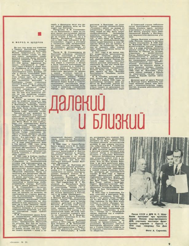 Trang 9 của tạp chí Ogoniok số đặc biệt điểm lại những sự kiện liên quan đến quan hệ giữa 2 nước, từ thế kỷ15-16 , khi Afanasy Nikitin trong cuốn "Hành trình qua 3 biển" đã nhắc đến đất nước Shabat mà theo các nhà sử học, từng là một quốc gia nằm trên lãnh thổ VN và CPC Ảnh trong trang: Đại sứ Liên xô tại Việt Nam I.S.Sherbakov trao tặng Huân chương Lênin cho Phó chủ tịch nước VNDCCH Tôn Đức Thắng-người tham gia cuộc nổi dậy của các thủy thủ Pháp tại Odessa năm 1919.