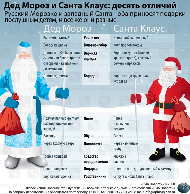 Lễ Giáng sinh và Năm mới ở châu Âu thường gắn liền với hình ảnh Ông già Noel hay Ông già Tuyết đi phát quà cho trẻ em ngoan. Nhìn qua thì có vẻ đó là một nhân vật, nhưng thật ra giữa Ông già Tuyết (Дед Мороз) của Nga và Ông già Noel - Santa Claus (Father Christmas, hay còn có tên là Saint Nicholas hay Kris Kringle) của phương Tây có rất nhiều điểm khác nhau. Xin giới thiệu cùng các bạn 10 điểm khác nhau về ngoại hình của hai nhân vật thần thoại này (nghe chừng hình ảnh Ông Tiên hay Ông Bụt của Việt Nam với chòm râu dài và trắng như cước có vẻ giống với Ông già Tuyết của Nga hơn là gióng Ông già Noel):