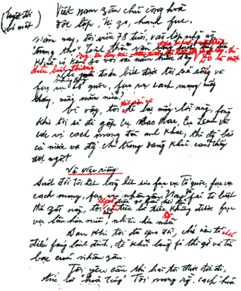 Di chúc của Bác Hồ kính yêu giờ cũng đã được công khai, ước nguyện của Bác được hỏa thiêu, tro chia đều ra mỗi phần 33,33...33% đặt tại ba quả đồi ba miền Bắc, Trung Nam, mỗi bà con lên thăm Bác trồng một cái cây con lấy bóng mát cho bà con khác (1)... nhưng việc giữ lại thi hài của Người là nguyện vọng của toàn Đảng (xếp đầu tiên), toàn quân (xếp thứ hai), toàn dân (xếp thứ ba) ta nên việc chúng ta làm khác đi ý nguyện của Người, chắc Người cũng hiểu và thông cảm.