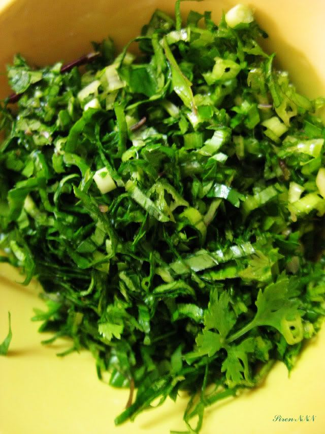 Chọn một vài chiếc măng bánh tẻ, không già và cũng không non quá, khoảng 5 chiếc bà con người Thái vừa gánh ra chợ bán, mua về làm sớm để đảm bảo măng vẫn còn tươi và ngọt. Sau khi bóc bỏ bẹ lá, rửa sạch và dùng dao băm nhẹ đều trên củ măng rồi thái sao cho sợi măng trông nhỏ đều và đẹp ![]() Cho măng đã thái vào nồi luộc chín tới, nêm chút muối cho măng đỡ hăng, vớt ra để ráo. ![]() Cho đường vào trước trộn đều cho măng được giòn, sau đó trộn rau thơm (mùi ta và mùi tàu hay còn gọi là ngò gai) đã thái nhỏ. ![]() Chanh bỏ hạt, vắt đều lên măng và trộn kỹ cho ngấm ![]() Em làm gia vị trộn riêng hơi cầu kỳ 1 chút bao gồm: gia vị, tỏi, ớt tươi, ớt khô nướng, hạt tiêu Thái (Mắc khén), một chút bọt ngọt, tất cả giã nhỏ và bằm thêm 1 chút rau thơm nữa. Như thế này ![]() Nước mắm pha riêng 1 đĩa nhỏ cho có vị chứ không dùng nhiều nộm sẽ ướt không dậy được mùi thơm của lạc rang. ![]() ![]() Lạc rang chín, bỏ vỏ, giã rối. Sau khi trộn đều, ta được đĩa nộm thành phẩm với các vị chua cay mặn ngọt, thơm của rau gia vị, bùi của lạc, nổi hơn cả vị ngọt tươi của măng rừng giòn ngon, rất hấp dẫn. Đĩa nộm này, em chưa bày xong đã có 5 đôi đũa chuẩn bị hạ cánh oanh tạc ạ