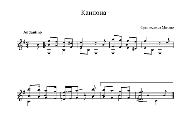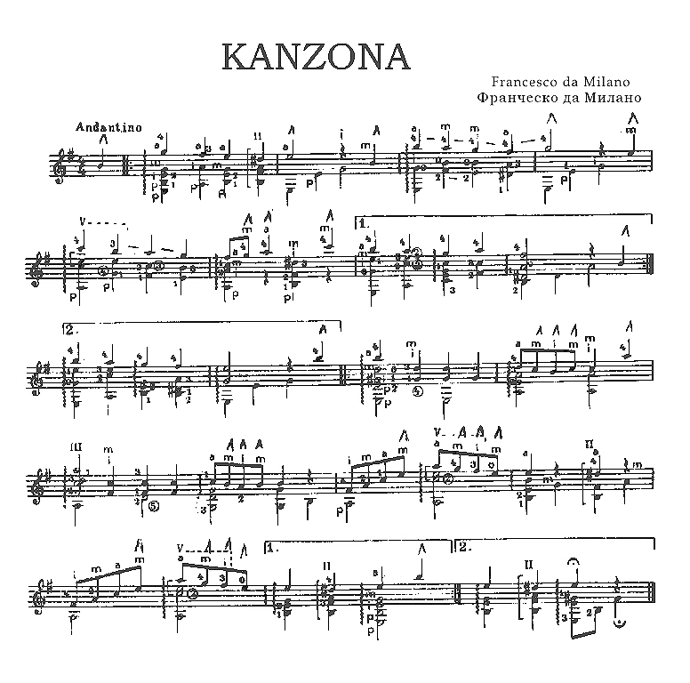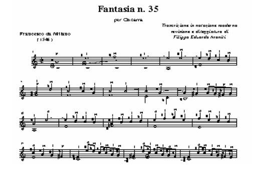 Trên đây chúng ta đã được xem bản nhạc Канцона, trên đó có một dòng tên nhạc sĩ bằng tiếng Nga. Có thể hiểu rằng tất cả những phần còn lại đều từ bản gốc. Bây giờ chúng tôi xin giới thiệu một bản nhạc gốc của Franchesco da Milano, bản Fantasia n.35.