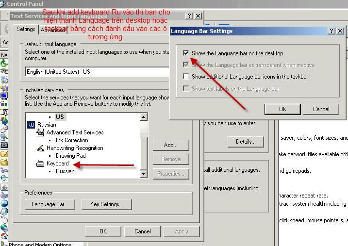 - Bạn vào Control Panel --> Regional and Language setting ---> Languages --> Details --> Add thêm bàn phím Ru vào nữa là xong. (hiện nay bạn không cần và cũng không nên cài đặt fonts chữ Nga vào máy tính vì tất cả đều đã có sẵn trong bộ fonts Unicode rồi!).