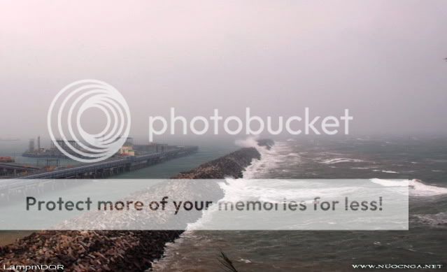 Nước chảy ....Accropode mòn. Đê nó nằm im mãi thì cũng cựa quậy một tẹo cho đỡ mỏi. Các vị trí chuyển dịch hoặc lún rất ít và bằng mắt thường khó nhận thấy. Đê đang trong thời kỳ bảo hành. He he, chúng tôi không mời mà yêu cầu nhà thầu của Hà Lan sang để khắc phục. Đê trong cơn bão vừa qua (ảnh cũ up lại, các bác thông cảm): Và vào những ngày này tàu bè tấp lập vào lấy dầu: