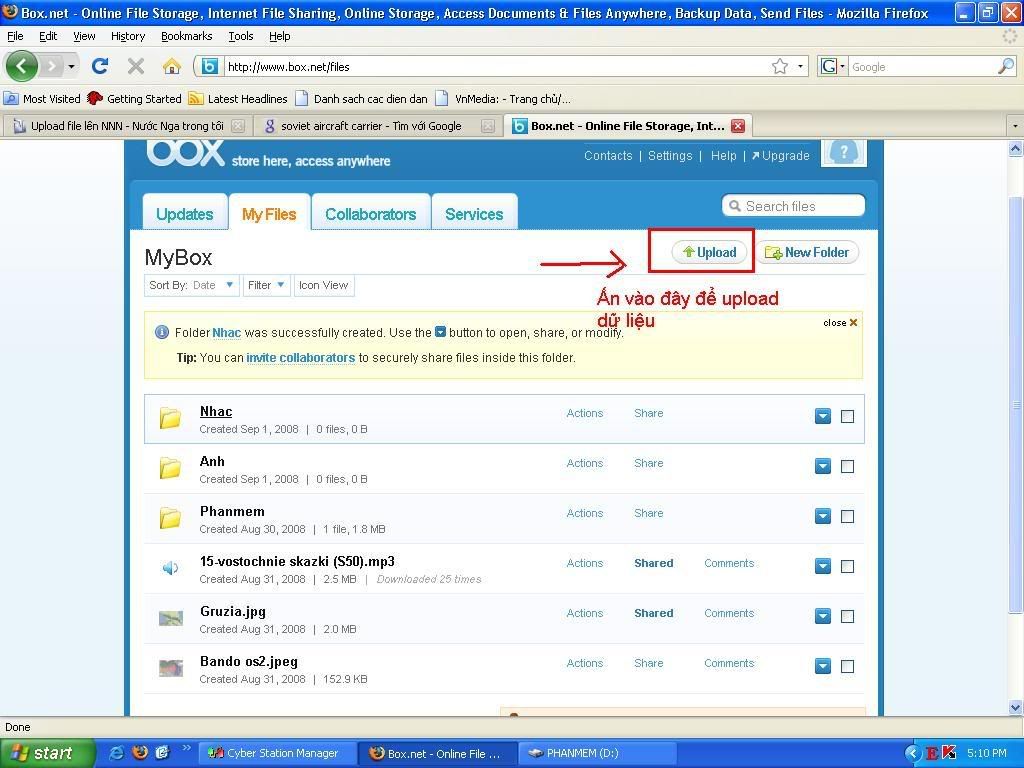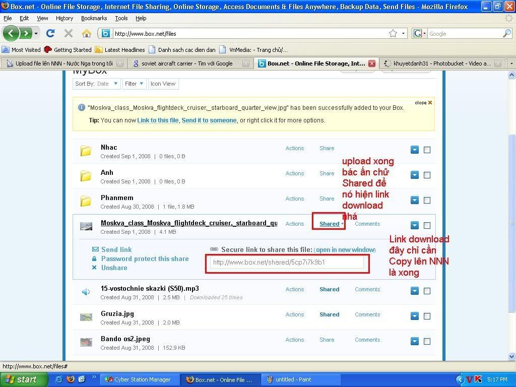 Hiện nay do nhu cầu cần một nơi để upload dữ liệu và chia sẻ cho mọi người trong NNN nên em tạo một Account trên box.net.
