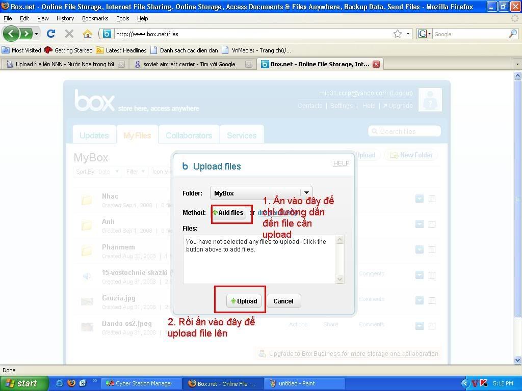 VD: khuyetdanh35@yahoo.com.vn. Em sẽ tạo hộ rồi PM vào hộp tin cho. Vì Box.net cấm IP Việt Nam đăng kí nên các bác không đăng kí được đâu