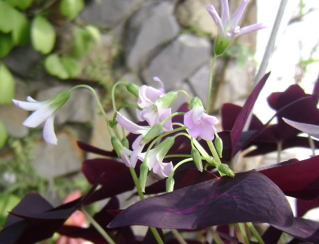 Đấy là lá (màu đỏ) và hoa mảnh mai màu hồng phải không chị? Em nghi là cây hoa tên "bướm đêm" - lá mịn màng, xếp cánh rủ như bướm đêm đậu ngủ. Không biết có đúng lọai này không ạh?