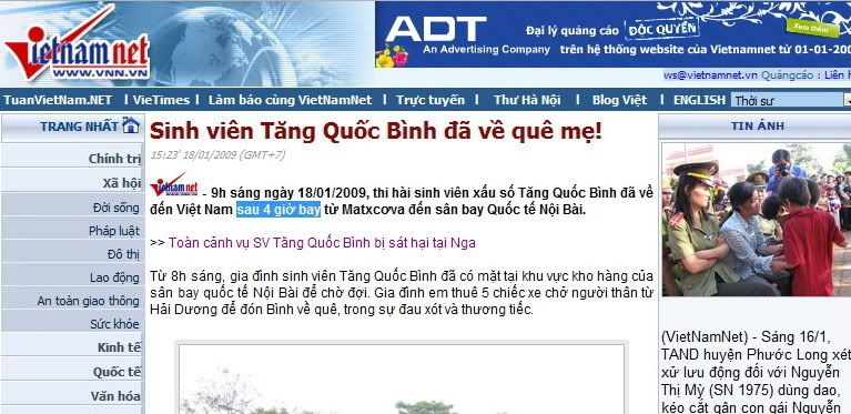 - 9h sáng ngày 18/01/2009, thi hài sinh viên xấu số Tăng Quốc Bình đã về đến Việt Nam sau 4 giờ bay từ Matxcơva đến sân bay Quốc tế Nội Bài.