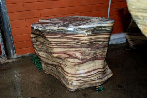 Cạnh đó có đặt bộ bàn ghế bằng đá vôi sọc dải tuyệt đẹp của Sơn La. Đá này có tuổi Devon muộn, cách này gần 400 triệu năm. Đây là chiếc ghế trong bộ bàn ghế đá độc đáo đó.