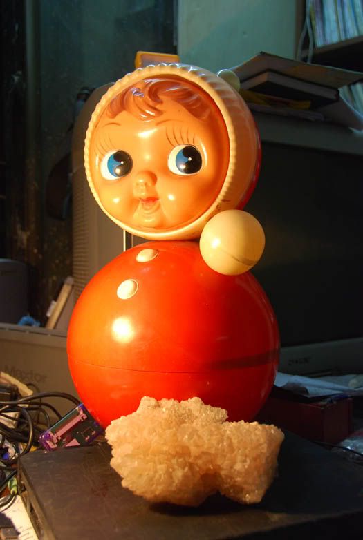 Geo mới nhận được 1 tặng phẩm quý: Tinh đám canxit. Đặt cạnh nàng lật đật Nga La Tư, chụp ảnh, chia vui cùng mọi người.