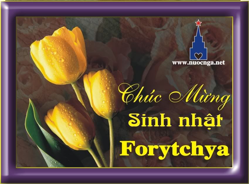 Chúc mừng sinh nhật chị Forytchia. Em "trâu chậm" không mong được "uống nước trong" chỉ mong chị đừng giận vì hôm qua bận không lên mạng chúc mừng sinh nhật chị được. Chúc chị tuổi mới (không biết tròn 30, hay 20 như bác HDA và bác Michả nói) luôn tươi trẻ như tuổi 20, mặn mà, đằm thắm như tuổi 30 và hạnh phúc như ... 10 tuổi ("biết ăn biết ngủ, biết học hành là ngoan" thôi).