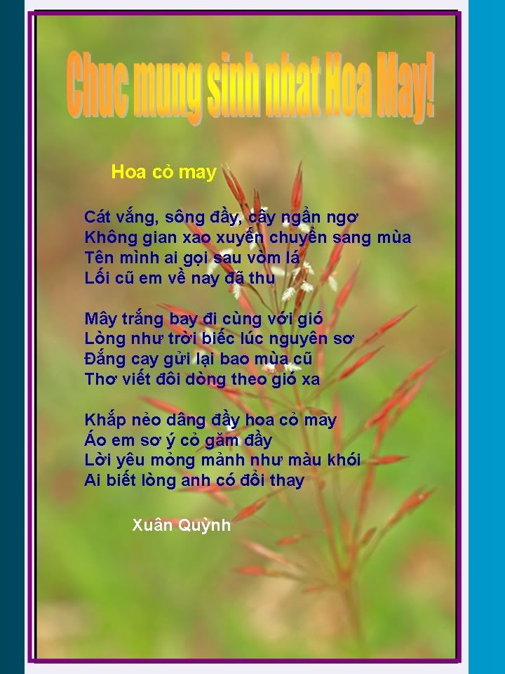 Em xin xếp hàng sau chị U để chúc sinh nhật chị Hoa May, nhưng nói thật là em không ưa hoa cỏ may lắm vì ngày xưa em có mỗi một cái quần để đi học mà nó cứ bám đầy hoa CM làm tối nào cũng mất nửa tiếng đồng hồ để nhặt hết nó dưới ngọn đèn dầu tù mù. Nếu các bác băn khoăn là tại sao không nhặt ban ngày thì em xin không giấu gì là đến lúc đó mới dám cởi quần ạ.
