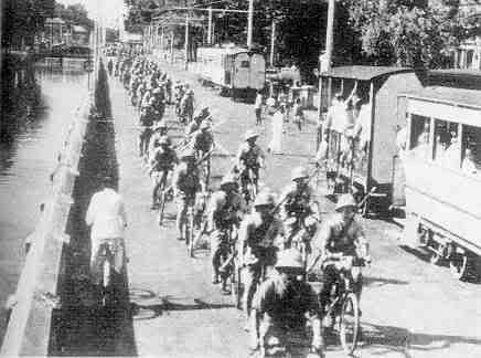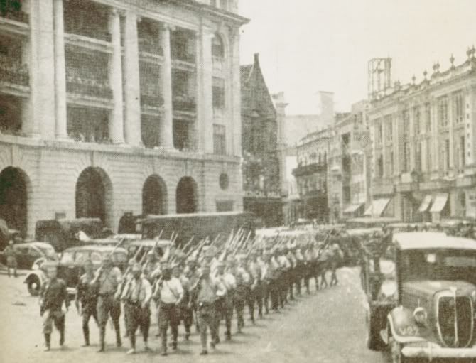 Mặt trời mọc 12/1941 – 5/1942 Các nước Đồng minh đã đánh giá quá thấp về sức mạnh của quân phát xít Nhật. Đồng minh cho rằng Nhật chưa có thể làm lên trò trống gì trong giai đoạn này. Mặc dù đã có nhiều báo cáo ở Đại lục và đến cuối năm 1941 một đội quân tình nguyện Hoa kỳ đã được huy động, họ cũng vẫn tin tưởng rằng các loại máy bay chiến đấu của phương Tây vẫn có khả năng vượt trội hơn hẳn các đối thủ cùng loại của Nhật Bản. Song, cuộc tấn công của quân Nhật vào 7 – 8/12/1941 thực sự là cú choáng váng cho những ai vẫn còn có những mộng tưởng và họ cũng không bao giờ ngờ đến một sức mạnh như vậy. Quân Nhật đã dường như ngay lập tức có mặt khắp mọi nơi trong cùng một thời điểm: Ngày đầu tiên một mình đơn độc tuyên bố chiến tranh, quân Nhật đã tấn cồng bằng đường biển, lục địa hoặc đường không trên khắp Thái bình dương: Trân châu cảng, Manila, Midway, Hong Kong, Thailand, Shanghai, Wake, Guam, Singapore, Ấn Độ và các vùng lân cận phía đông Hà Lan Malaya và Burma. Quân Nhật thường chiếm ưu thế về số lượng, trang bị khí tài cũng như chiến thuật và huấn luyện, các điều kiện đó đã cho phép chúng di chuyển rất nhanh xuyên suốt Thái bình dương. Các đảo lần lượt bị quân Nhật nhanh chóng đánh chiếm: 1941 08/12: Doanh trại quân đội nước ngoài ở Thượng Hải ![]() Col Samuel L. Howard và ban tham mưu trung đoàn hải quân số 4 của ông ta tại Thượng Hải, 28/11/1941. John E. Drake Papers, 10/12: Guam ![]() Tù binh Nhật tại Guam. 25/12: Hong Kong ![]() Quân Nhật Tại Hồng Kông 1941 1942 02/1: Manila, Philippines ![]() Quân lính Nhật đổ bộ vào Philippines, 16/12/1941 25/1: Balikpapan, Java ![]() Máy bay Nhật đánh bom xuống gần tàu tuần dương của Hà Lan ở Java 14/2: Quân dù Nhật đổ bộ lên mỏ dầu Palembang, Sumatra ![]() Những bể dầu bị quân Nhật đốt cháy tại Palembang, Sumatra ngày 14/2/1942 17/2: Singapore ![]() Quân đội Nhật sau khi đánh chiếm Singapore, đang hành quân qua trung tâm thành phố, 2/1942 19/2: Hàng không mẫu hạm thứ nhất đánh bom tấn công cảng Darwin ![]() Đánh bom cảng Darwin 1942 05/3: Batavia, Java ![]() Đội quân lính xe đạp của Nhật tiến vào Batavia, Java, 3/1942 20/3: Chiếm đóng toàn bộ Admiralty và Western Solomons ![]() Máy bay oanh tạc B-17 của Mỹ ném bom xuống các vị trí quân sự của Nhật trên đảo Solomon 08/4: Rangoon, Burma ![]() Lính Nhật tiến vào Burma 1942 09/4: Bataan ![]() Quân Nhật tại Bataan 07/5: Corrigedor thất thủ, kết thúc toàn bộ sự kháng trả trên Philippines ![]() Quân đội Nhật bản diễu binh mừng chín thăng tại thủ đô Manila của Philippines Trong khi lực lượng bộ binh của Nhật đang xúc tiến mạnh mẽ, lực lượng hải quân đế quốc Nhất cũng tàn phá mọi thứ trên đường đi của chúng. Duy chỉ có một thắng lợi nhỏ nhoi của quân Đồng minh là họ đã phá hủy được 5 chiếc tàu vận tải Balikpapan của địch đang thả neo vào ngày 24/1. Toàn bộ lực lượng hải quân đế quốc Nhật đều có khả năng phối hợp các cuộc tấn công của chúng với tàu chiến và binh lính đã được huấn luyện cùng nhau cho các chiến dịch ban đêm. Hầu như tất cả các lực lượng thủy quân của Đồng minh chưa hề có sự phối hợp tác chiến cùng với nhau như vậy trước đó, chứ chưa nói đến thực hiện chiến dịch vào ban đêm. Hầu như các tàu chiến của họ cũng đã bị "quá đát" và không có khả năng đánh địch ban đêm hoặc yểm trợ bằng không quân. Ngày 10/12, chiếc HMS Prince của Wales và chiếc HMS Repulse bị đánh chìm trên được đi cứu viện Singapore, những chiến hạm này không có sự yểm trợ bằng không quân trên đường. Ngày 27/2, một trận đánh trên vùng biển Java đã nổ ra, kết quả là tất cả các sức mạnh thủy quân còn lại trên vùng biển Đông nam Á của quân Đồng minh bị phá hủy hoàn toàn. Ngày 9/4, chiếc HMS Hermes và một số tàu chiến khác bị tàu hàng không mẫu hạm Thứ nhất của Nhật đánh chìm tại Ấn Độ dương. Với sự thất thủ của Philippines. Cuộc chiến của quân Nhật thực hiện đã lên đến đỉnh điểm, mặc dù nó xem ra có vẻ khó có thể hình dung được tại thời điểm đó. Lực lượng hải quân của Đồng minh hiện rất kém ưu thế về số lượng tàu chiến, máy bay và binh lính, họ trở nên quá yếu nằm giữa quân Nhật và cảng Moresby ở New Guinea. Một lực lượng đổ bộ của quân Đồng minh với mệnh lệnh phải chiếm giữ bằng được cảng Moresby đã được tiến hành, nhưng cũng bị chặn đứng và phải dừng lại tại vùng biển San hô, trong trận này Mỹ bị mất chiếc tàu Lexington, trong khi đó quân Nhật cũng bị mất chiếc IJN Shoho. Quân Nhật cuối cùng cũng tạm dừng các cuộc tấn công http://worldwar2database.com |