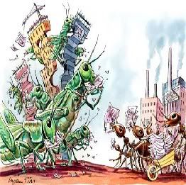 Kiến thấy đàn đàn châu chấu thật giàu có bèn nói với ngân hàng rằng: “Cho họ vay nhiều hơn nữa đi, vì kiến chúng tôi chẳng muốn vay mượn gì đâu.” Khả năng sản xuất ra sản phẩm thực của kiến tốt hơn nhiều so với năng lực tài chính của chúng.
