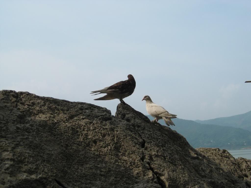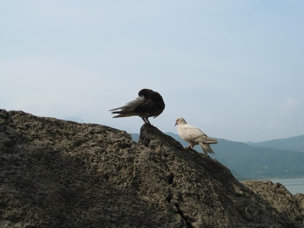 Ngạc nhiên chưa? Có một đôi chim bồ câu bình yên rỉa cánh trên đỉnh hòn đá giữa mênh mông sông nước