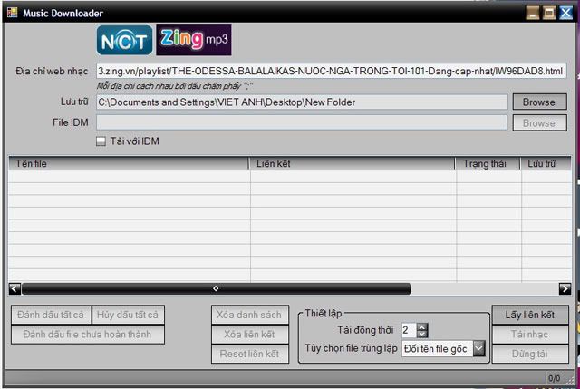 Trước tiên các bác tải cái này về, lúc vào link tải (như hình dưới)– các bác cần gõ hoặc dán pass: loadmf.co.cc vào rồi nhấn nút "Unlock File" ![]() Sau khi tải về, các bác giải nén, nhấp đúp vào file thu được để khởi chạy chương trình. Giờ ta mở album nhạc cần tải ở Zing lên, copy link bôi đen: ![]() Dán link vào, và xác định chỗ chứa file sẽ tải về : ![]() Giờ chúng ta nhấp vào nút “lấy liên kết” : ![]() Vậy là xong, giờ chỉ việc nhấp vào nút "Tải nhạc" và chờ cho chương trình làm nốt phần việc của mình . Chúc các bác thành công nhé!