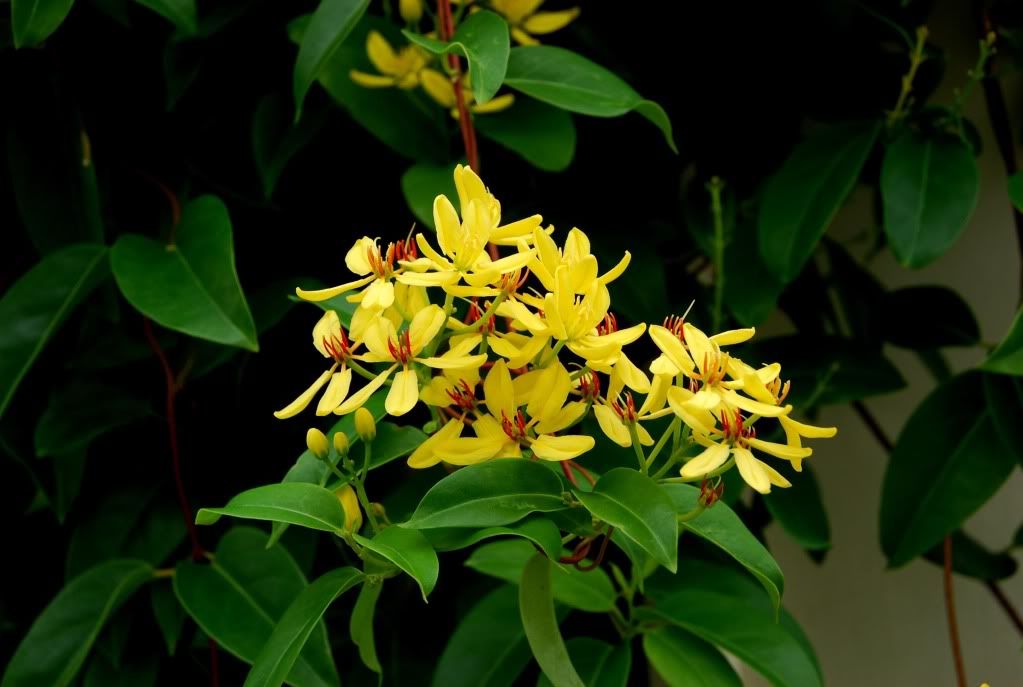 Chà! Bác Geo chụp đẹp mê ly, thích thật. Hoa này trong Nam gọi là Kim Đồng, ngoài Bắc thường gọi là Mai Hoàng Yến. Tên tiếng Anh là Maiden's Jealousy (tên khoa học là Tristellateia australasiae, thuộc họ Malpighiaceae). Cây thuộc loại dây leo, thân gỗ, bông vàng rất dễ thương. Nhà CK cũng có một cây nhỏ nhưng cũng đã nở nhiều bông . ![]() Hoa này có tên rất đẹp: Ngọc Nữ, Rồng Nhả Ngọc. (Tên tiếng Anh Glorybower, tên khoa học Clerodendrum thomsoniae, thuộc họ Verbenaceae. Các tên khác: Glory-bower, Bagflower, Bleeding Glory-bower, or Bleeding Heart Vine.) Cây này cũng là cây leo thân gỗ. Lá là vị thuốc chữa bệnh viêm tai giữa mãn tính. Người ta thường trồng hai cây này gần nhau, chúng thường leo quấn quít như "Tiên Đồng-Ngọc Nữ" Các bác xem ảnh này có giống Rồng nhả ngọc không ?(sưu tầm) ![]() CK tìm ra hoa này cũng gọi là Rồng Nhả Ngọc ( chụp hôm qua trên sân thượng ![]() Các bác để ý lá của chúng giống y chang nhau.
