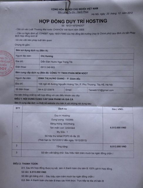 2. Thanh toán phí hosting trang chủ tại địa chỉ www.nuocnga.net 02 năm, từ 28/03/2012 đến hết 28/03/2014, số tiền: 10.000.000 VNĐ (Mười triệu đồng).