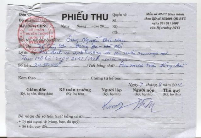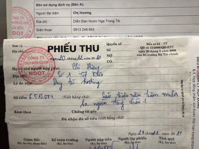 Phiếu thu tiền hosting 4 năm đã qua (1/4/2008 - 1/4/2012):