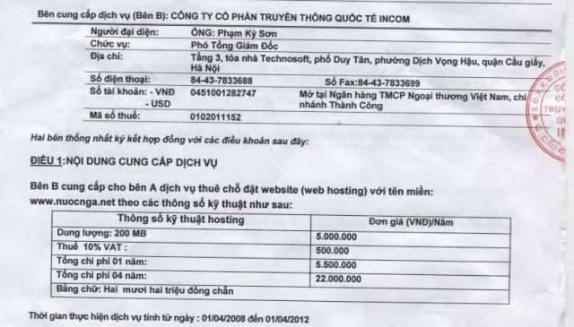 Ghi chú: Hồi trước, ngày 28/03/2008 BQT NNN đã trả phí hosting cho trang chủ 01 năm đầu tiên kể từ khi bắt đầu chuyển sang ký hợp đồng hosting với Công ty INCOM thuộc VASC vào cuối tháng 3/2007 (giá hồi đó là 6.600.000đ cả VAT), cộng thêm trả tiền duy trì tên miền (domain) cho 5 năm liền từ 28/03/2008 - 28/03/2013 (160.000 đ/năm x 5 = 800.000 đ).