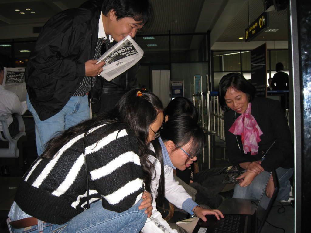 Đúng 1:30, em đánh xe ra khỏi nhà bắt đầu chuyến đi lịch sử. Trời bắt đầu có sương mù. Có nhiều đoạn đường sương mù dày đặc nên xe chạy như rùa. May mà đoàn em xuất phát sớm không thì muộn giờ bay. Đúng 4:30 Đoàn HP đã tới Nội Bài. Có lẽ chúng em đến sớm nhất. Sau khi cho mọi người vào phòng đợi, em phải xuống bãi đỗ xe đợi Hùng Admi. Vừa mệt, vừa buồn ngủ song chẳng thể chợp mắt. Và rồi Bác Admi cũng tới. Bác chu đáo quá. Sau khi dẫn em đi gửi xe, bác đưa em vào phòng đợi và làm thủ tục check in. Thế là chỉ sau hơn 1 giờ nữa, chúng em sẽ có mặt tại Đà Nẵng. Thời đại "tên lửa", sướng thật. Nhưng Delay, delay rồi lại delay. Đến bây giờ em mới thấm thía cái cay, cái đắng của từ này. Sương mù dày đặc Sân bay Nội Bài: ![]() Và đây, đúng là dân 3N, tranh thủ truy cập mọi lúc mọi nơi (chính hoàn cảnh này đã cho ra đời một SP đấu giá kỳ quặc nhất trong các kỳ đấu giá của 3N) ![]() Và rồi thì sau 2 giờ Delay, chúng em cũng ra phi trường chuẩn bị cất cánh ![]() Rồi thở phào khi rời khỏi mặt đất ![]() Và đang lơ lửng trong không trung ![]() Đà Nẵng đây rồi ![]() Xuống máy bay thôi ![]() Và đây là cảnh tượng đầu tiên khi ra khỏi sân bay ![]() ![]() Hổ Già đây, mong mãi hôm nay mới được gặp mặt bác này bằng xương, bằng thịt! ![]() ![]() ![]() ![]() ![]() ![]() Đây rồi, Cô gái Digan ![]() Niềm vui gặp gỡ ![]() ![]() ![]() ![]() ![]() ![]() ![]() ![]() ![]() ![]() ![]() ![]() ![]() ![]() ![]() ![]() ![]() ![]() ![]() ![]() ![]() ![]() ![]() ![]() ![]() ![]() ![]() ![]() ![]() ![]() ![]() ![]() ![]() ![]() Tham quan Đà Nẵng ![]() ![]() ![]() ![]()