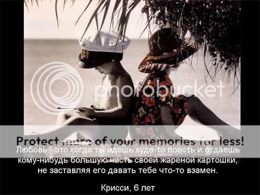 Когда у бабушки начался артрит, она не могла больше нагибаться и красить лаком ногти на ногах. Тогда дедушка стал делать это для нее, даже после того, что у него тоже начался артрит в руках. Это любовь. Ребекка, 8л. Когда тебя кто-то любит, он произносит твое имя по-особенному. Твоему имени уютно у него на язычке. Билли, 4г. Любовь - это когда ты делишься своей жареной картошкой и не ждешь, чтобы с тобой поделились тоже. Крисси, 6л. Любовь - это то от чего ты улыбаешься, даже когда устал. Терри, 4г. Любовь - это когда мама варит папе кофе и сперва пробует сама, вкусно ли получилось. Дэни, 7л. Любовь - это то что оказывается вместе с тобой в комнате на Рождество, если ты перестанешь разворачивать подарки и прислушаешься. Бобби, 5л. Если ты хочешь научиться лучше любить, нужно начать с кого-то, кого ты терпеть не можешь. Никка, 6л. Любовь - это как старенькие дедушка и бабушка, которые до сих пор друзья, даже после того,что они так хорошо друг друга узнали. Томми, 6л. Больше всех меня любит мама. Что-то не видно, чтобы кто-нибудь еще меня целовал на ночь. Клэр, 5л Любовь - это когда мама дает папе лучший кусочек курицы. Элейн, 5л. Любовь - это когда мама видит папу грязным и потным и все равно говорит, что он красивее, чем Роберт Редфорд. Крис, 8л. Любовь - это когда твой щенок тебя облизывает даже после того, как ты его оставил одного на целый день. Мари Энн, 4г. Я знаю, что моя старшая сестра меня любит, потому, что она мне отдает все свои старые вещи и ей приходится покупать себе новые. Лорен, 4г.