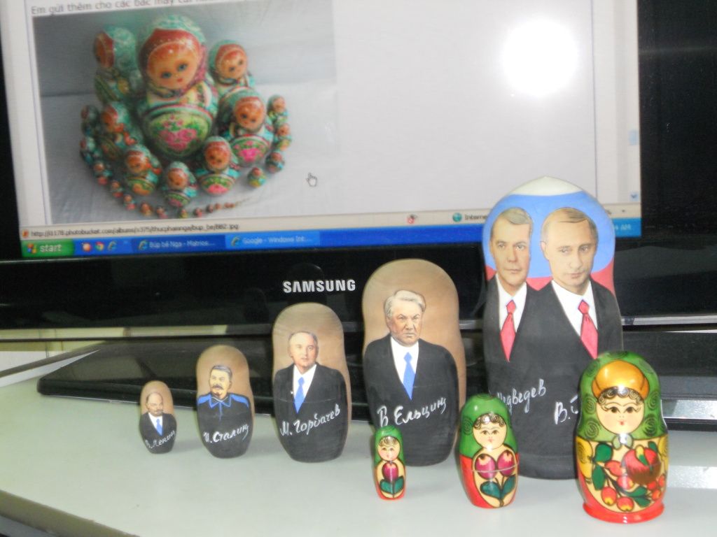 Xin góp thêm bộ sưu tập Matryoshka khiêm tốn của người viết bài này. Một bộ có 3 con và một bộ 5 con mà đúng ra là phải có 9-10 con, trong đó thiếu con mang danh Breznhep đã có hơn 20 năm đứng đầu nhà nước LX. Được cái là cả 2 bộ đều được gửi mua tại chính Mạc Tư Khoa.