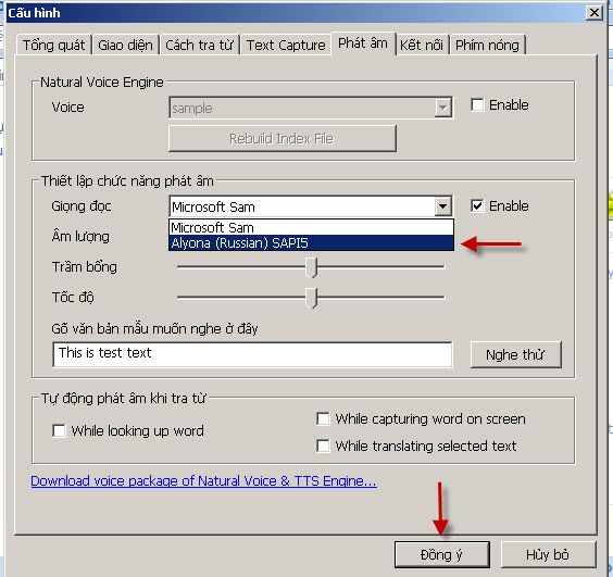 Nếu muốn Lingoes phát âm, các bạn cào phần cấu hình của Lingoes, chọn Natural Voice Engine là Infovox Desktop 2.2, giọng đọc là Alyona (russian), nhấn nút Đồng ý là xong. Bấm vào ảnh để xem kích cỡ đầy đủ.