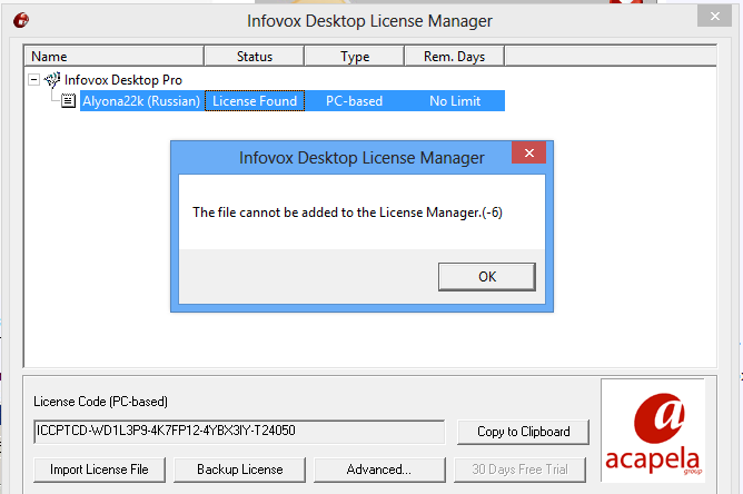 Kóc không biết bạn đã thao tác như thế nào, nhưng nhìn vào ảnh của bạn thì thấy rằng License đã Found, thời gian sử dụng là No Limit, nghĩa là bạn đã cài đặt thành công phần TTS và Voice Russian rồi. (Có thể bạn đã nhấn nút Import License File thêm lần nữa nên có thông báo lỗi như vậy!