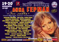 ![]() Ngày mai (14/2) là sinh nhật của Anna German. Để tưởng nhớ đến nữ ca sĩ tài ba này, trong hai ngày 19-20 tháng Hai năm 2009 tại sân khấu của Nhà hát Ca nhạc nhẹ sẽ diễn ra hai chương trình ca nhạc hoàng tráng mang tên "Tiếng vọng tình yêu" (Эхо любви). Trong các chương trình này sẽ có sự tham gia của Valentina Tolunova, Anne Veski, Galina Nevara, Valentina Ponomareva, Olga Zarubina, Ekaterina Shavrina, Albert Asadullin, Galina Nenasheva, Igor Nadzhiev, Olga Pirags, Natalia Nurmukhamedova, Oleg Bezinskikh, Galina Uletova, Ivan Ilichev, Larisa Makarskaja, Anna Shirochenko, Ilona Krasavtsev, Nadezhda Kryghina và ban nhạc "Bến bờ Nga". Dẫn chương trình là Svetlana Morgunova và Ivan Ilichev. Trong chương trình sẽ vang lên nhiều ca khúc trong các chương trình biểu diễn của Anna German như "Когда цвели сады", "Эхо любви", "Останься", "Люблю тебя", "Ждите весну", "Я жду весну", "Русская раздольная", "Надежда", "Белая черемуха", "Колыбельная", "Дай мне помечтать", "Четыре карты", "А он мне нравится", "Не спеши", "Танцующие Эвридики", "Снова мамин голос слышу", "Ты опоздал", "Не забыть этот день", "Аве Мария", "Чтобы счастливым быть", "Ты, только ты", "Любви негромкие слова", v.v. Với những khán giả thường xuyên tham dự các chương trình kỷ niệm Anna German sẽ thấy không ít điều bất ngờ và khám phá thú vị vì nhiều nghệ sĩ chuẩn bị riêng cho chương trình này những bài hát mới trong các tiết mục biểu diễn của Anna German mà trước đây chưa từng được thể hiện trong các chương trình ca nhạc. Sẽ có phần trình diễn của một vài đôi song ca nữa.