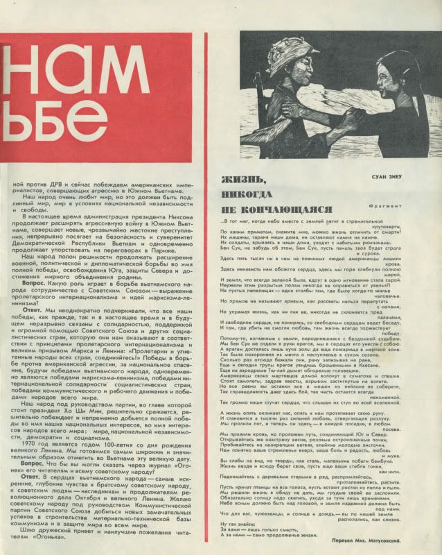 Ngay bên cạnh, là bài trả lời phỏng vấn tạp chí "Ngọn lửa nhỏ" của Thủ tướng VNDCCH Phạm Văn Đồng. Cạnh đó là bài thơ "Cuộc sống không bao giờ kết thúc", trích từ một trường ca của nhà thơ Xuân Diệu. Hungmgmi không biết đây là trường ca nào, bác nào biết xin mách hộ: