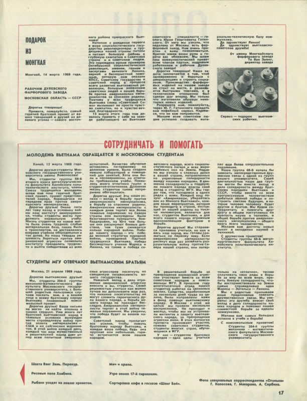 Còn khung dưới là hai bức thư. Bức thứ nhất là của lớp 68 B-năm thứ 2 Khoa Luyện kim Trường DHBK Hà Nội gửi các bạn sinh viên trường MGU, với mong muốn được kết nghĩa với một lớp của trường MGU: Bằng hoạt động của mình, hai lớp chúng ta sẽ đóng góp vào sự nghiệp chính nghĩa của nhân dân 2 nước Việt Nam và Liên xô anh em, để cùng với toàn thể loài người tiến bộ giành được thắng lợi cuối cùng và xây dựng tương lai tươi sáng. Ở đó, người với người sẽ là anh em và bè bạn....