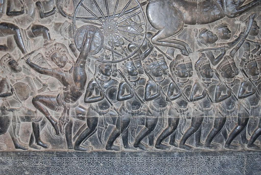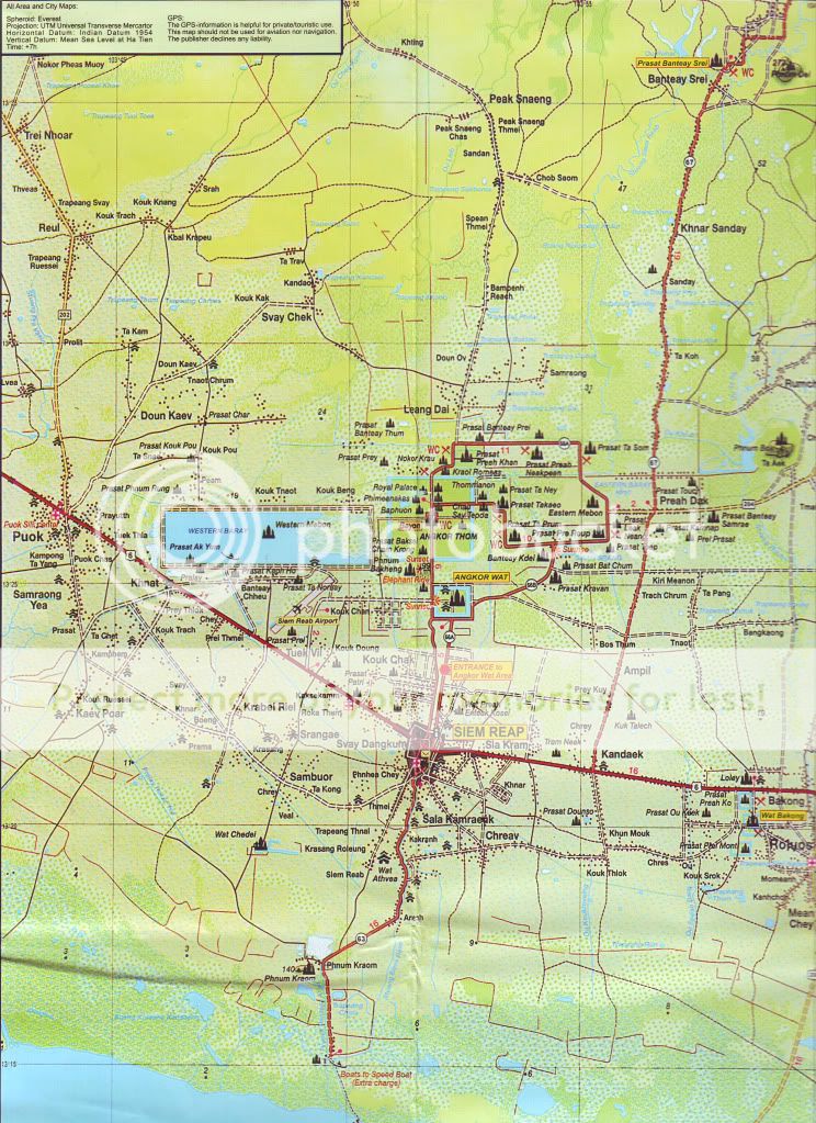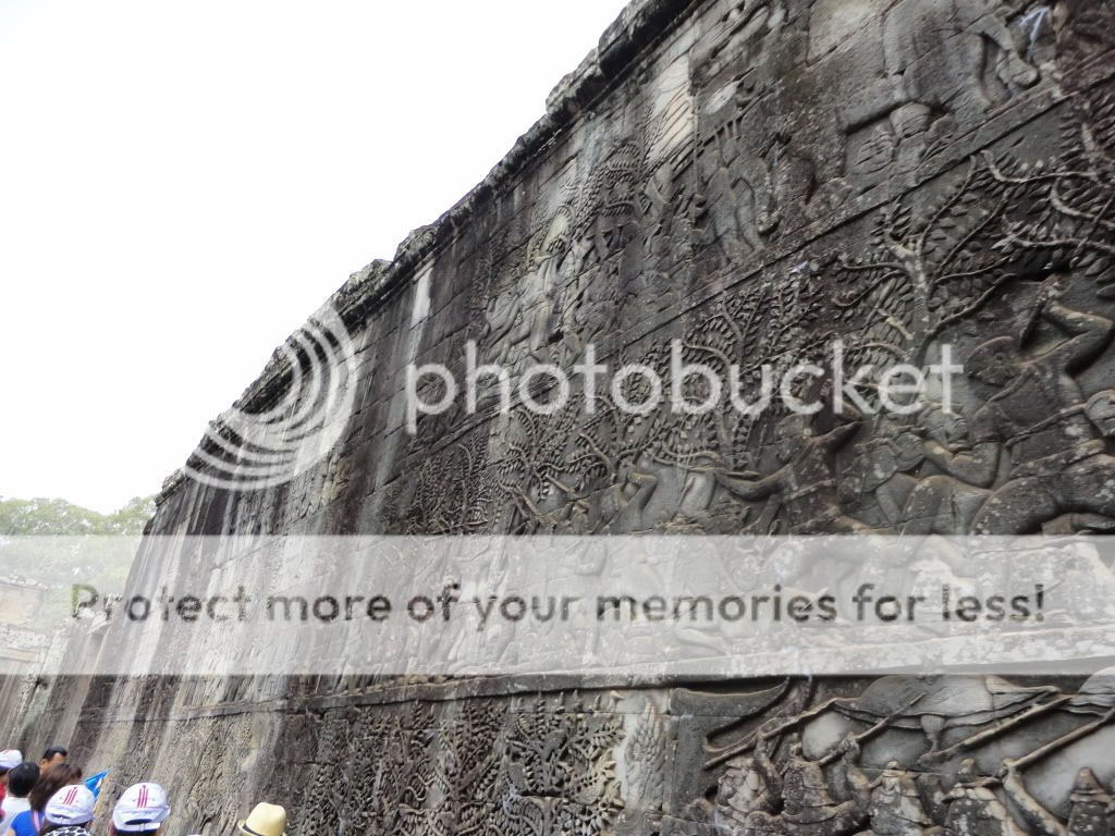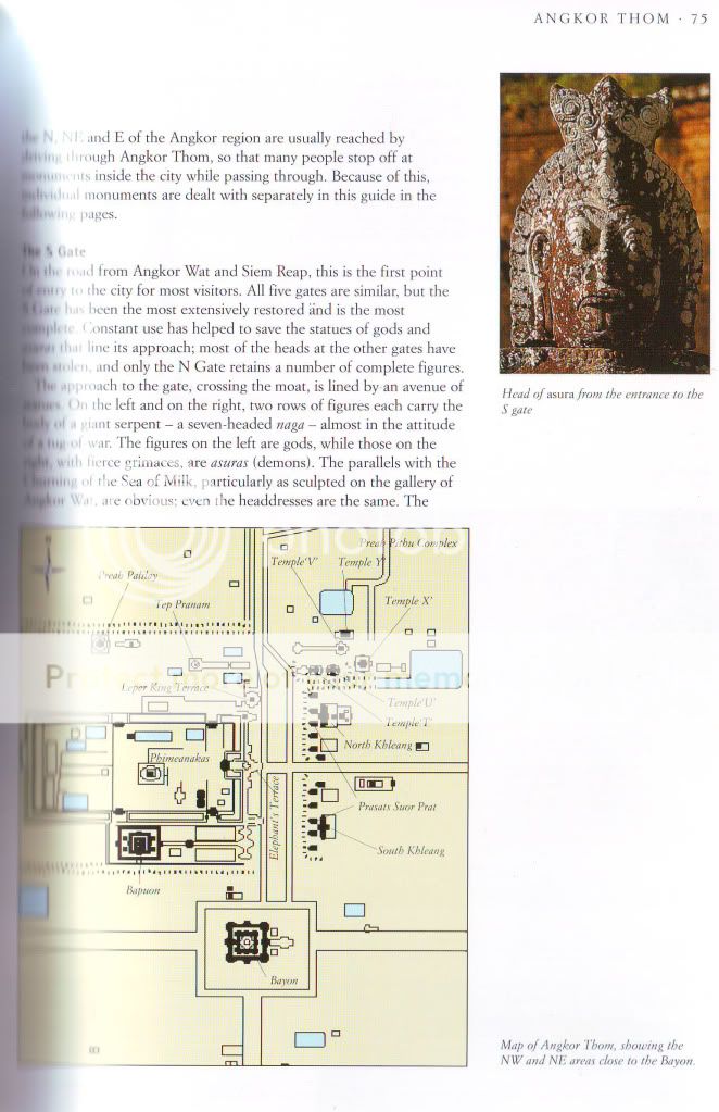 Từ trung tâm thành phố Siem Reap (tiêu diệt quân Xiêm-giống như Sát Thát ở Việt Nam) đi về phía Bắc theo quốc lộ 66A khoảng 6km, chúng ta sẽ đến Quần thể Angkor. ![]() Nhìn vào bản đồ, chúng ta thấy được hướng chính của Angkor Wat là phía Tây. Hôm tôi đến vào buổi sáng, do bị ngược nắng, không thể ghi ảnh được nên chúng tôi tham quan Angkor Thom trước. ![]() Angkor Thom-Kinh đô Vĩ đại (còn gọi là Đế Thích), là thành phố kinh đô lâu dài nhất và cũng là cuối cùng của Vương quốc Khmer được vua Jayavarman VII xây dựng vào cuối thế kỷ thứ 12. Sau khi vua Suryavarman II là người xây dựng Angkor Wat băng hà vào khoảng năm 1150, Campuchia rơi vào tình trạng rối ren, vô chính phủ. Quân Chiêm Thành nhiều lần tấn công và cuối cùng cưỡng chiếm Angkor Wat. Jayavarman VII sinh thời vốn là một người thích sống ẩn dật, chọn lối sống thanh bần, ông thờ ơ với mọi biến động trong đời sống. Đến 50 tuổi, thấy đất nước quá tang thương vì loạn lạc và bị ngoại xâm dày xéo, ông thấy không còn con đường nào khác hơn là theo con đường kiếm cung mới mong cứu được đất nước qua cơn nguy khốn. Năm 1181, ông dấy binh khởi nghĩa, sau ròng rã bốn năm chiến đấu, ông đánh đuổi được Chiêm Thành ra khỏi đất nước mình, khôi phục lại thanh bình và xây dựng nên một đất nước hùng mạnh. Để thực hiện sự nghiệp giải phóng đất nước, trước khi lên ngôi Jayavarman VII bắt đầu xây dựng lại quân đội, rồi tiến hành nhiều cuộc phản công, trong đó có một trận hải chiến oanh liệt miêu tả trên bức tường đá chạm nổi ở các đền Bayon và Bantay Chrma. Sau khi hoà bình được lập lại, Jayavarman VII lên ngôi. Lúc này ông khoảng 50 tuổi. Ông liền bắt tay vào việc khôi phục lại kinh đô và cho xây dựng ở đây một khu thành mới trên khu vực của kinh thành cũ Yashodharapura ở gần đó về phía Tây Bắc do vua Suryavarman II là người xây dựng. ![]() ![]() Cổng thành ở phía Nam được được dẫn từ chiếc cầu vượt qua hào nước xung quanh Angkor Thom (và cả Angkor Wat). Hào nước này ngoài chức năng phòng vệ, trước đó nó còn là con đường để vận chuyển đá từ vùng núi phía Tây Bắc bằng bè gỗ. Dọc theo mỗi bên đường có một hàng các Deva (theo đạo Hindu, đây là các vị thần), mỗi hàng nâng một Naga (hình tượng một con rắn dài to khỏe, có nhiều đầu) trong tư thế kéo co. Có vẻ đây là một hình tượng về truyền thuyết Samudra Manthan (khuấy Biển Sữa) - một truyền thuyết phổ biến tại Angkor. Đền-núi Bayon, hay chính cổng thành có thể là cái trục của sự kiện khuấy biển. Các Naga này có lẽ đại diện cho sự chuyển dịch từ thế giới loài người tới thế giới của thần thánh (đền Bayon), hoặc là các thần hộ vệ. Các cổng vào có kích thước 3,5 x 7 m và có thể đã được đóng bằng các cánh cửa gỗ. Cổng phía Nam cho đến nay là nơi được thăm viếng thường xuyên nhất, do đây là lối vào chính của khách du lịch. ![]() ![]() ![]() Đứng từ xa, chúng ta đã thật sự choáng ngợp bởi sự hùng vĩ ngôi Đền chứa trong đó biết bao điều bí ẩn. Đến gần, tận mắt nhìn rõ những chi tiết, tận tay sờ vào những khối đá trầm lặng hiện lên những vết hằn, sự bào mòn thấm đượm màu thời gian. Một cảm giác thật sự ớn lạnh nếu ta đứng một mình trước những khối đá ẩn chứa đầy sự huyền bí ấy! Bayon được xem là ngôi đền trung tâm của khu phức hợp Angkor Thom. Khu đền Bayon nằm ở trung tâm Angkor Thom, cách cổng thành khoảng 1 cây số rưởi. Bayon là khu đền súc tích với những trang trí chạm khắc bằng đá đẹp đẽ. Được xây dựng trong khoảng cuối thế kỷ thứ 12 và đầu thế kỷ thứ 13 như là đền chính thức của vua Jayavarman VII, tin theo Phật giáo Đại thừa khác với tín ngưỡng Ấn Độ giáo như các vua trước nhưng vẫn theo truyền thống vua thần (devaraja). Vua Jayavarman VII cải giáo sang Đại thừa vì các vua đời trước nối nghiệp vua Suryavarman II theo Ấn Độ giáo, người xây dựng Angkor Wat đã để quân Chiêm Thành đánh bại. Sau khi Jayavarman VII chết, những vua nối tiếp với tín ngưỡng khác nhau như Ấn Độ giáo, Phật giáo Nguyên thủy, đã xây thêm cho ngôi đền dựa theo tín ngưỡng của mình. Cấu trúc của Bayon gồm ba tầng mà cả ba tầng đều đổ nát nhiều, gạch đá nằm ngổn ngang khắp nơi. Hai tầng dưới bố trí theo hình vuông, tô điểm bằng những phù điêu trên tường. Tầng ba được sắp xếp theo hình tròn với nhiều tháp mà các mặt đá có hình khuôn mặt. Hình ảnh nổi bật nhất của Bayon vẫn là những ngọn tháp cao vút ở trung tâm bằng đá tảng, chạm khắc thành 2, 3 và chung chung là 4 khuôn mặt nhìn bốn hướng. Kiến trúc của Bayon được xem như có phong cách của trường phái Baroque (phong cách nghệ thuật Baroque – thời Phục Hưng ý, mang hình thức kiểu cách, trang trí rậm rạp), trong khi Angkor thuộc phái cổ điển. Sự tương đồng của vô số khuôn mặt khổng lồ ở trên các tháp của đền Bayon với các bức 