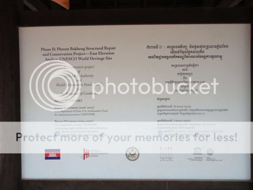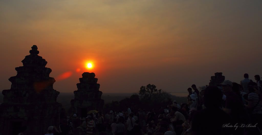 Góp thêm với bác: Chiều sớm: ![]() Toàn cảnh: ![]() ![]() Phnom Bakheng- Chùa Bakheng. Đây là núi nhân tạo. Khi xây dựng quần thể Angkor, người ta đào hệ thống mương rất lớn xung quanh- nhằm mục đích để vận chuyển đá đến công trường đồng thời còn có chức năng bảo vệ- phòng thủ. Khối lượng đất đào đó, người ta đắp thành ngọn núi trên. Thoạt tiên, họ xây dựng ngôi chùa. Sau đấy họ tiếp tục xây dựng các đền thờ. Hiện nay, Tổ chức UNESCO và các Tổ chức khác cùng Nhà nước Cambodia phối hợp bảo tồn, tôn tạo. Họ đã có phương án đề xuất. Khách tham quan sẽ phải đi vòng quanh theo con đường khác để lên đến đỉnh. Con đường đi thẳng lên, họ không cho đi để tránh bị sạt lở và sẽ bị hủy hoại: ![]() ![]() ![]() Khách du lịch rất đông (đông như quân Nguyên). Ít thấy bóng dáng của cảnh sát hay dân phòng. Và các bác cũng chú ý và thấy rằng, hầu như không thấy rác bừa bãi: