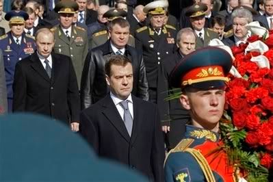 ![]() Tổng thống Nga Dmitri medvedev đã bắt đầu ngày làm việc đầu tiên của mình sau khi nhậm chức bằng lễ viếng tượng đài các anh hùng chiến tranh Vệ quốc Vĩ đại. Trong thời khắc chuẩn bị kỷ niệm ngày Lễ Chiến thắng, người đứng đầu nhà nước Nga đã đặt vòng hoa tưởng niệm tại ngọn lửa Vĩnh Cửu bên mộ Chiến Sĩ Vô Danh cạnh bức tường điện Kremlin. Vòng hoa được kết từ những cành thông và hoa hồng đỏ, bao quanh là dải băng màu cờ Nga mang dòng chữ:” Tổng thống Nga kính viếng mộ Chiến Sĩ Vô Danh”. Theo Itar-Tass, sau khi các chiến sĩ đại đội vệ binh danh dự đặt vòng hoa trước ngọn lửa Vĩnh Cửu, Medvedev vuốt lại dài băng và cúi đầu mặc niệm hàng triệu người đã ngã xuống trong chiến tranh Vệ quốc Vĩ đại. Tham dự Lễ tưởng niệm có cựu Tổng thống Vladimir Putin, các vị lãnh đạo Chính phủ, Bộ quốc phòng, viện Duma quốc gia và các cựu chiến binh chiến tranh Vệ quốc. ![]() Theo tin từ http://www.vesti.ru/doc.html?id=180139