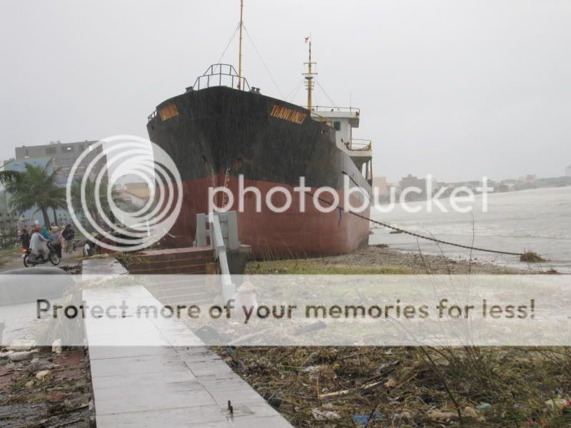 Hôm trước, đặt chân đến Đà Nẵng là HM phi ngay ra nơi này để tận mắt chứng kiến 3 con tàu lớn bị bão thổi dạt vào bờ, sát bờ kè đường biển NT Thành. Bão kinh hoàng thật!