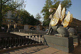 Những bức tượng quái vật sư tử đầu chim, chúng hiển nhiên là những phần hấp dẫn chính của cây cầu, đó cũng là một ví dụ trong vô số những bức điêu khắc ở St. Petersburg của Pavel Sokolov. Sokolov vốn tốt nghiệp học viện nghệ thuật Hoàng gia, công trình điêu khắc nổi tiếng nhất của ông là pho tượng Cô Gái Vắt Sữa và Chiếc Bình Sữa Vỡ đặt trên công viên Catherine ở Tsarskoe Selo.