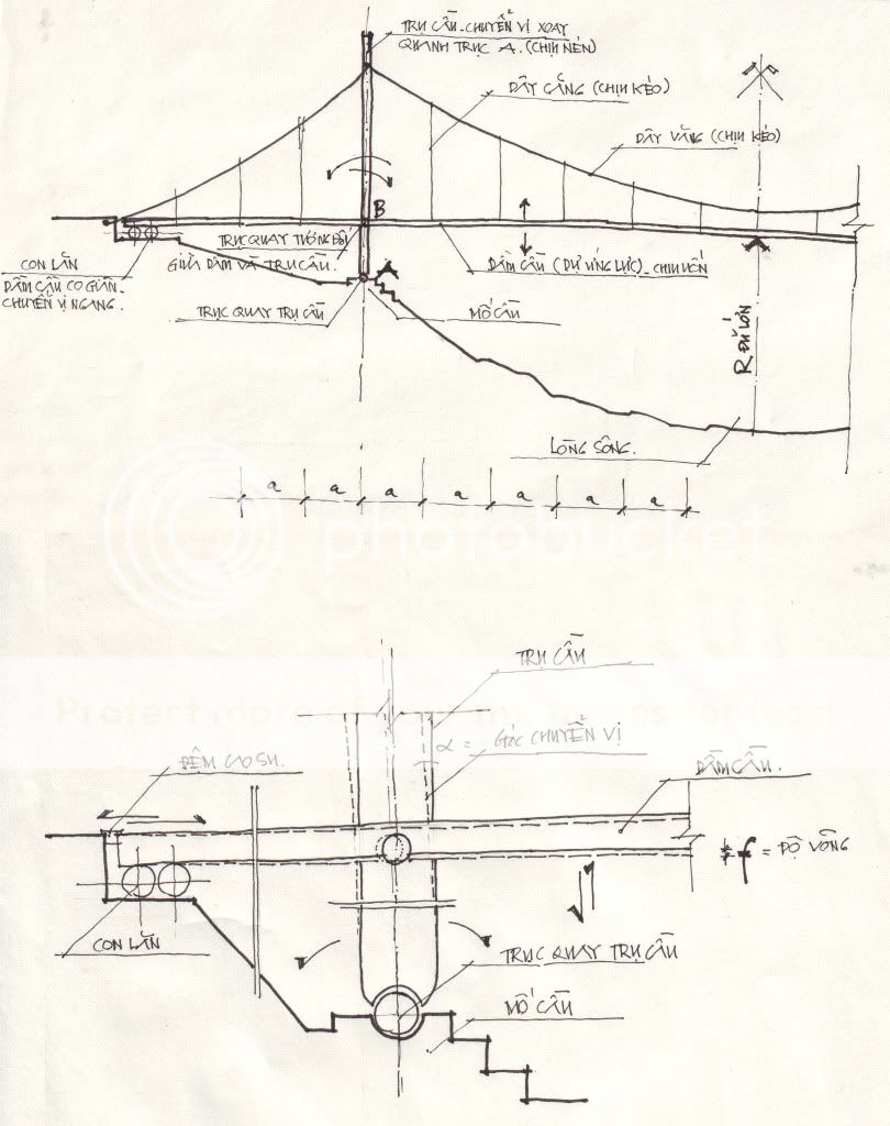Em không chuyên môn về cầu, bác lại "gắp lửa bỏ tay em" rồi! Thôi, em cũng cố gắng "trình bày" theo hiểu biết hạn hẹp của mình về nguyên lý hoạt động của cây cầu này qua ảnh chụp và minh họa của bác. -Hình 1: Sơ đồ cầu -Hình 2: Chi tiết trụ cầu ![]() Theo em nghĩ, dầm cầu sẽ là đường cong với một bán kính nào đó theo tính toán (có thể là dầm dự ứng lực). Khi có hoạt tải, cầu sẽ dao động lên xuống với biên độ cho phép. Do đó, em nghĩ, giữa dầm và trụ sẽ có một trục quay (trục B) để đáp ứng sự chuyển vị của dầm ra 2 biên. Khi ấy, trụ cầu sẽ có sự chuyển vị xoay quanh trục A. Ở vị trí tiếp giáp với đường dẫn, các con lăn sẽ có nhiệm vụ đảm bảo chuyển vị ngang của dầm. Thiển nghĩ của em là thế. Có thể các thuật ngữ, từ kỹ thuật về cầu em dùng không chính xác. Nếu muốn chắc chắn hơn, bác hỏi các bác chuyên về cầu nhé!