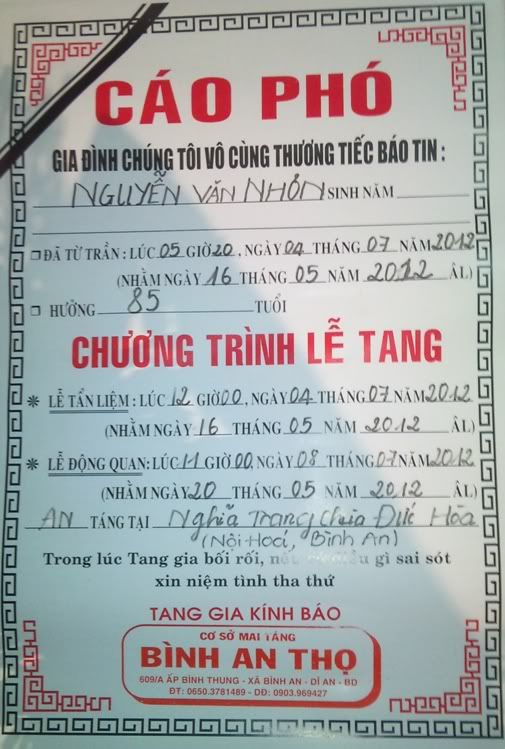 Xin được chia buồn với bạn Lê Văn Dùm cùng gia đình